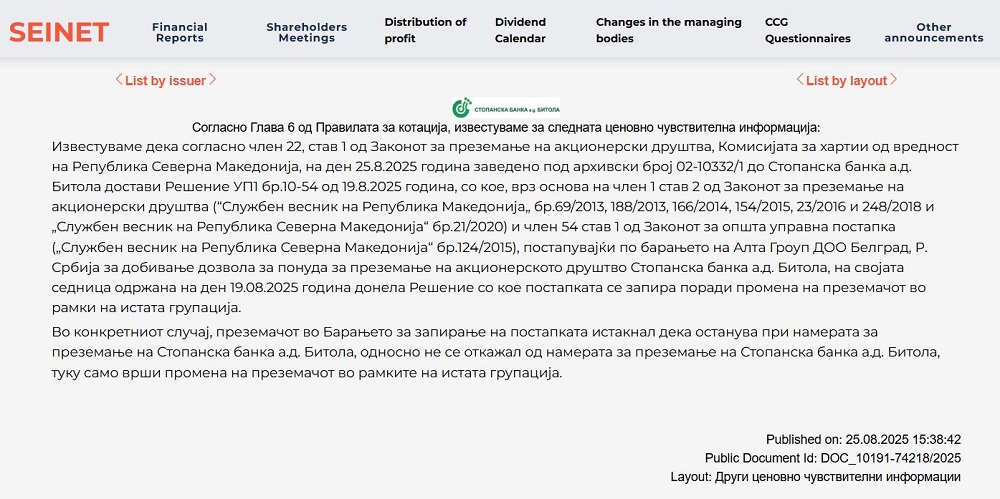Komisioni për Letra me Vlerë i Republikës së Maqedonisë së Veriut, me vendim të datës 19 gusht 2025, ndaloi procedurën për marrjen e Stopanska Banka a.d. Bitola me kërkesë të Alta Group ShPK Beograd. Vendimi iu dorëzua bankës më 25 gusht (nr. arkivor 02-10332/1).
