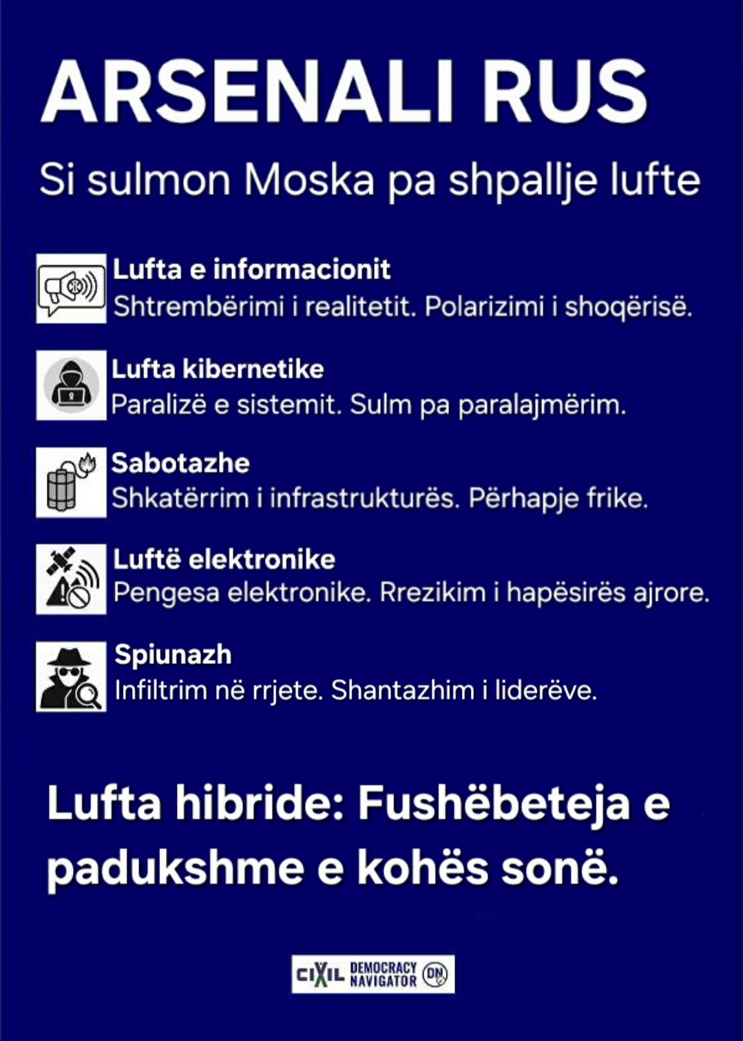 Lufta e Rusisë kundër botës demokratike nuk kufizohet vetëm te raketat, dronët apo tanket. Shumë kohë para se të qëllohet plumbi i parë, Moska ka aktivizuar një arsenal të gjerë mjetesh të dizajnuara për të dobësuar shtetet nga brenda – për të shtrembëruar realitetin, për të ndarë shoqëritë, për të paralizuar sistemet dhe për të minuar themelet e besimit. Ky është thelbi i luftës hibride: një fushatë e vazhdueshme dhe adaptive e zhvilluar në hije, ku vija e frontit kalon përmes institucioneve, rrjeteve dhe mendjes njerëzore.